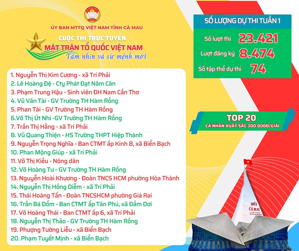 Theo đó, từ ngày 18/10-9/11, cuộc thi được Uỷ ban MTTQ Việt Nam tỉnh Cà Mau phát động, nhanh chóng lan toả mạnh mẽ tới các tầng lớp Nhân dân trong và ngoài tỉnh.