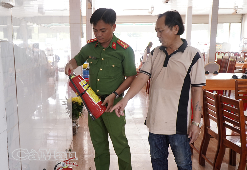 Lực lượng công an kiểm tra phương tiện phòng cháy, chữa cháy tại cơ sở kinh doanh Năm Ngoan.
