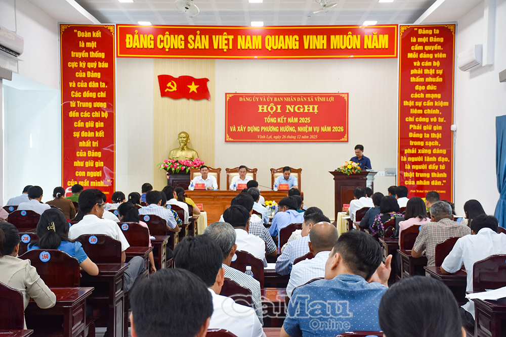 Báo Cà Mau Chiều 26/12, xã Vĩnh Lợi tổ chức Hội nghị tổng kết năm 2025 và triển khai phương hướng, nhiệm vụ năm 2026. Đến dự có đồng chí Phạm Thanh Chờ, Phó Chủ nhiệm Uỷ ban Kiểm tra Tỉnh uỷ Cà Mau.