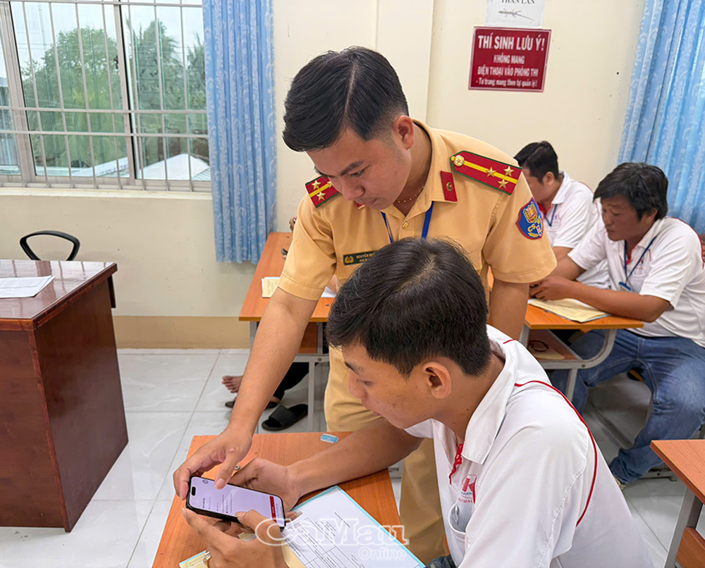 Cán bộ CSGT hướng dẫn thí sinh cài đặt và sử dụng VNeTrafffic.