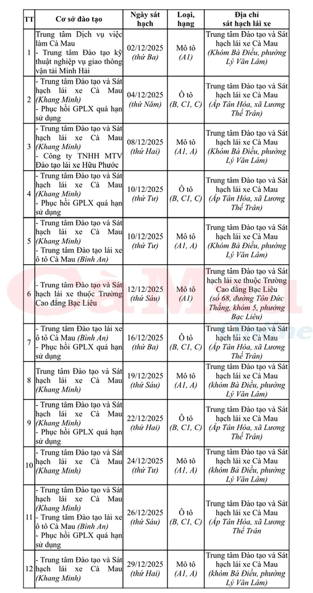 Báo Cà Mau Phòng Cảnh sát giao thông (CSGT), Công an tỉnh Cà Mau cho biết, để đáp ứng nhu cầu của người dân, trong tháng 12 tới sẽ tổ chức 12 kỳ sát hạch giấy phép lái xe, tăng 2 kỳ so với tháng 11.