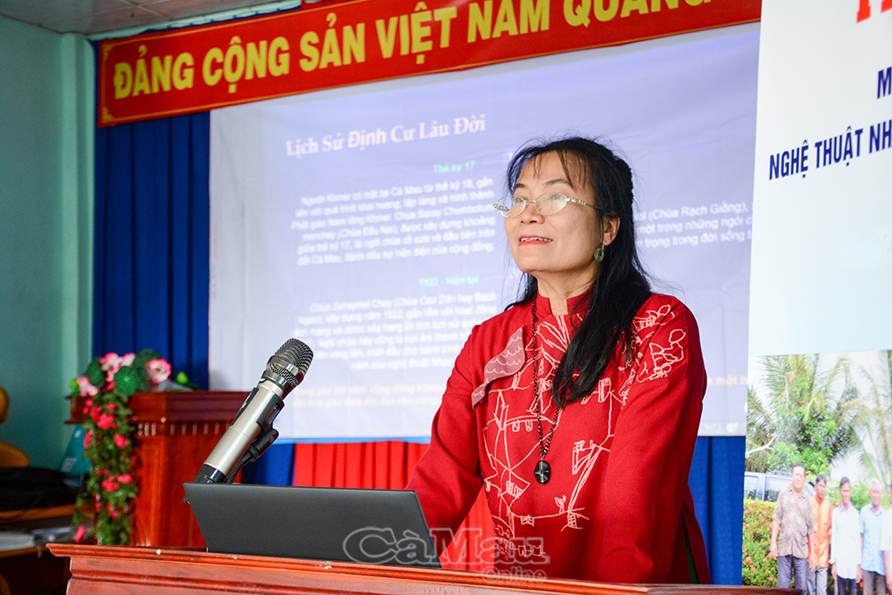Tiến sĩ Bùi Thị Hoa, Phó Phân viện trưởng phụ trách Phân viện Văn hoá, Nghệ thuật, Thể thao và Du lịch miền Nam giới thiệu tổng quan về cộng đồng người Khmer, vai trò và ý nghĩa của nghệ thuật Nhạc trống lớn của người Khmer ở tỉnh Cà Mau.