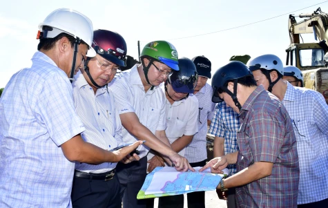 Bí thư Tỉnh uỷ Nguyễn Tiến Hải (thứ 2 từ trái sang), Phó chủ tịch UBND tỉnh Lê Văn Sử (bìa phải) cùng đoàn công tác khảo sát thực địa và trên sơ đồ về tiến độ và đánh giá hiệu quả khi cầu Gành Hào hoàn thành, đưa vào sử dụng.