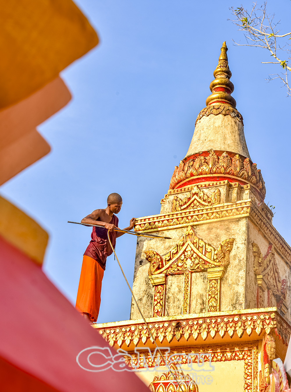Các vị sư chùa Xiêm Cán (phường Hiệp Thành) vệ sinh công trình kiến trúc trong khuôn viên chùa. Ảnh: HỮU THỌ