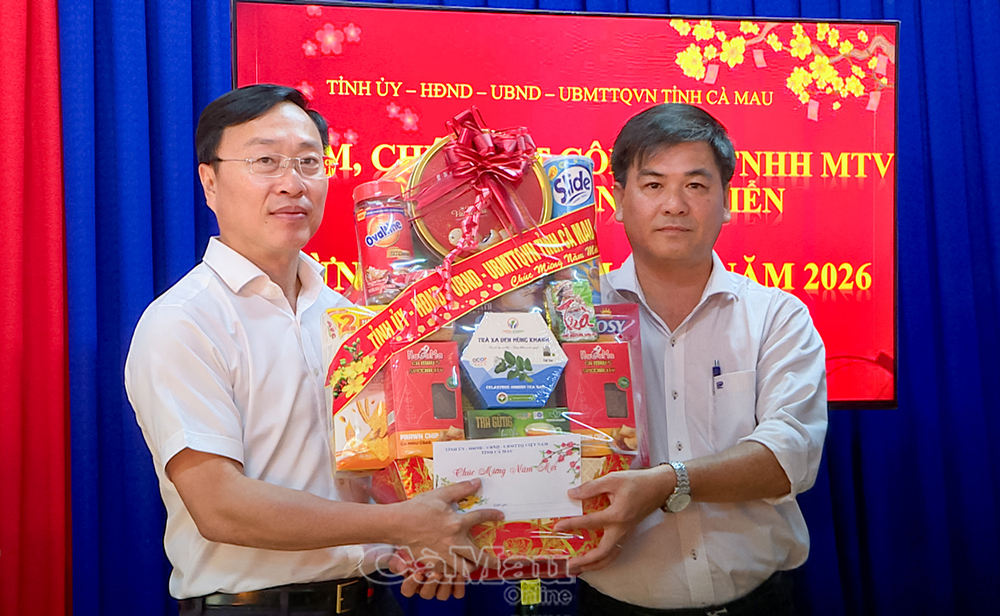 Ông Tiêu Minh Luân, Giám đốc Công ty TNHH MTV Lâm nghiệp Ngọc Hiển, báo cáo kết quả công tác năm 2025, bày tỏ vinh dự trước sự quan tâm của lãnh đạo tỉnh, khi thành lập đoàn đến thăm nhân dịp Tết cổ truyền.