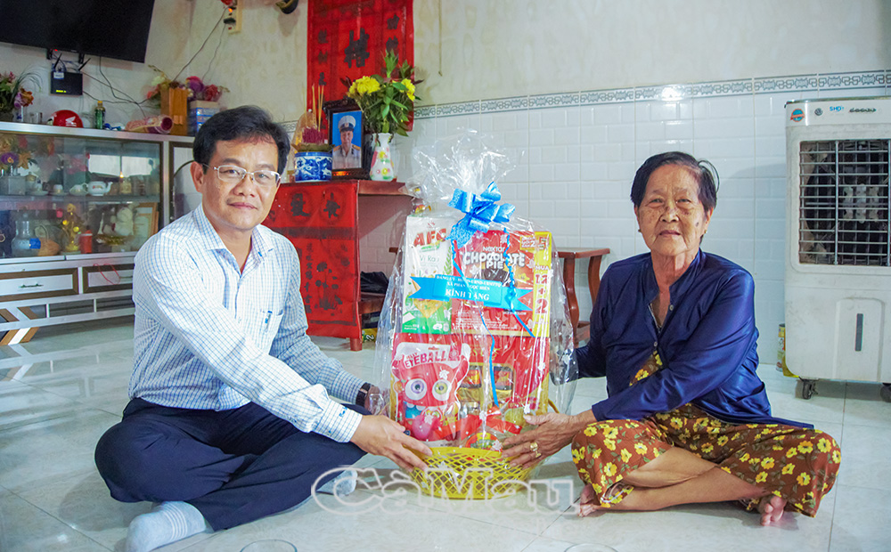 Đồng chí Ngô Minh Toại, Chủ tịch UBND xã trao quà cho gia đình chính sách Nguyễn Thị Bắc, ấp Kênh Huế.
