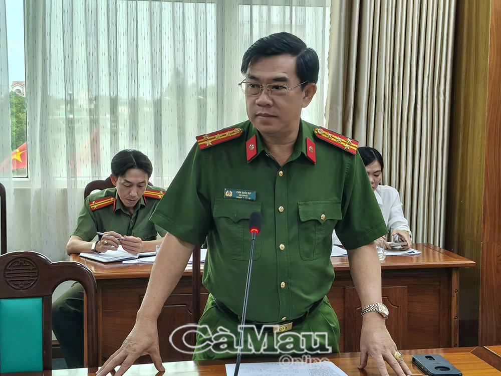 Đại tá Châu Quốc Huy, Phó Giám đốc Công an tỉnh, phát biểu tại hội nghị về tình hình đấu tranh phòng chống tội phạm.