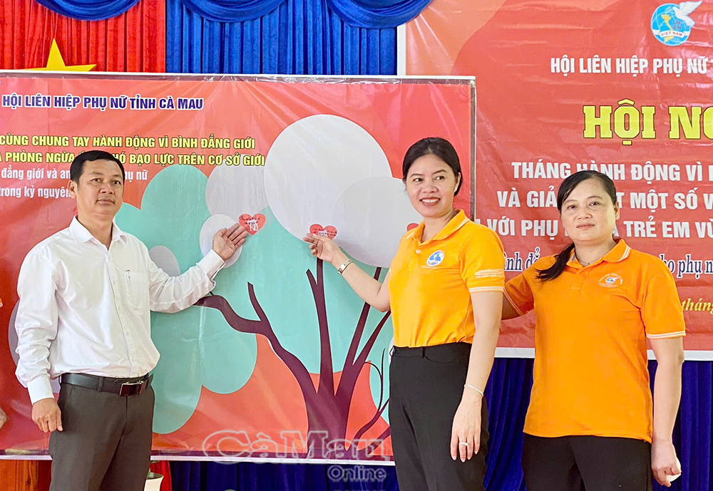 Bà Tô Thị Mỹ Thuận, Phó Chủ tịch Hội LHPN tỉnh Cà Mau và ông Trần Viết Luận, Phó Chủ tịch UBND xã Đất Mới, dán trái tim chứa thông điệp cam kết, đồng hành.