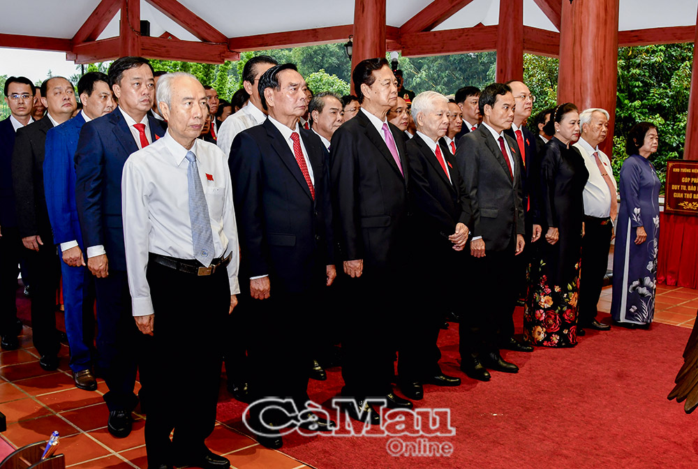 Đồng chí Trần Lưu Quang, Bí thư Trung ương Đảng, Bí thư Thành uỷ TP Hồ Chí Minh cùng các đồng chí nguyên lãnh đạo Đảng, Nhà nước, đại biểu khách mời Trung ương và toàn thể Uỷ viên Ban Chấp hành Đảng bộ tỉnh Cà Mau dâng hương tưởng niệm Chủ tịch Hồ Chí Minh tại Khu tưởng niệm. Ảnh: MỘNG THƯỜNG