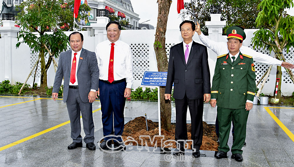 Đồng chí Nguyễn Tấn Dũng, nguyên Uỷ viên Bộ Chính trị, nguyên Thủ tướng Chính phủ (thứ 2, từ phải sang), trồng cây và chụp ảnh lưu niệm cùng các đồng chí lãnh đạo tỉnh Cà Mau tại khuôn viên Trung tâm Hội nghị tỉnh. Ảnh: MỘNG THƯỜNG