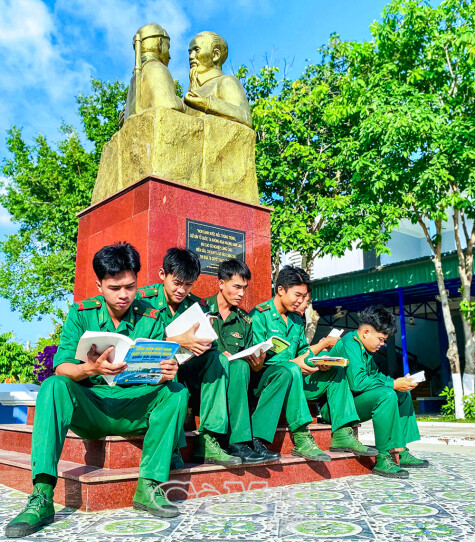 Cán bộ, chiến sĩ Đồn Biên phòng Hòn Khoai đọc sách bên tượng đài “Bác Hồ với chiến sĩ Biên phòng”.