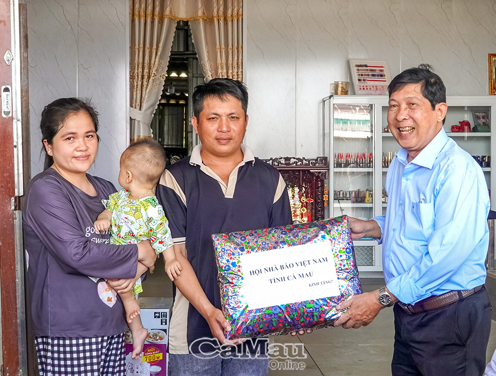 Đồng chí Nguyễn Thanh Dũng, Chủ tịch Hội Nhà báo Việt Nam tỉnh Cà Mau, tặng quà cho gia đình ông Lê Văn Hiếu.