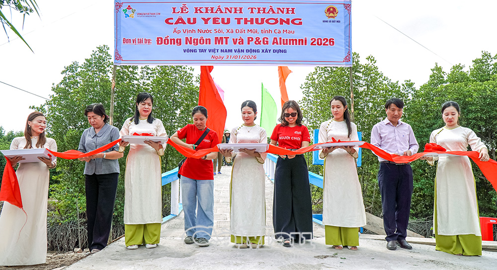 UBND xã Đất Mũi và Hội từ thiện Vòng Tay Việt Nam, đơn vị tài trợ, cắt băng khánh thành cầu Yêu Thương, tại ấp Vịnh Nước Sôi, xã Đất Mũi.