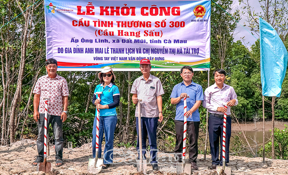 Hội từ thiện Vòng Tay Việt Nam và lãnh đạo xã Đất Mũi, cùng đồng chí Nguyễn Hồng Vệ, nguyên Bí thư Huyện uỷ Ngọc Hiển cũ (đứng thứ ba từ bên trái sang) thực hiện nghi thức khởi công cầu.