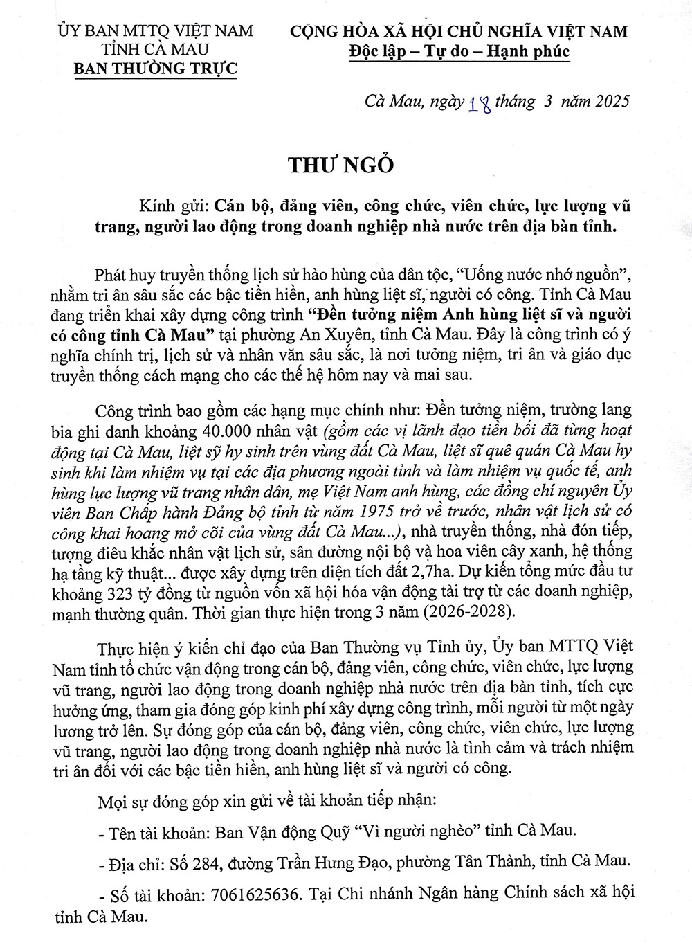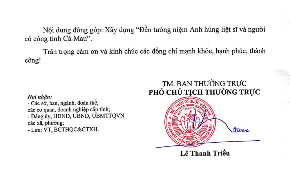 Phát huy đạo lý “Uống nước nhớ nguồn”, Uỷ ban MTTQ Việt Nam tỉnh Cà Mau vận động cán bộ, đảng viên, công chức, viên chức, lực lượng vũ trang và người lao động trong các doanh nghiệp nhà nước trên địa bàn tỉnh, chung tay đóng góp xây dựng "Đền tưởng niệm Anh hùng liệt sĩ và người có công tỉnh Cà Mau", công trình tri ân sâu sắc, thể hiện trách nhiệm và nghĩa tình của thế hệ hôm nay.