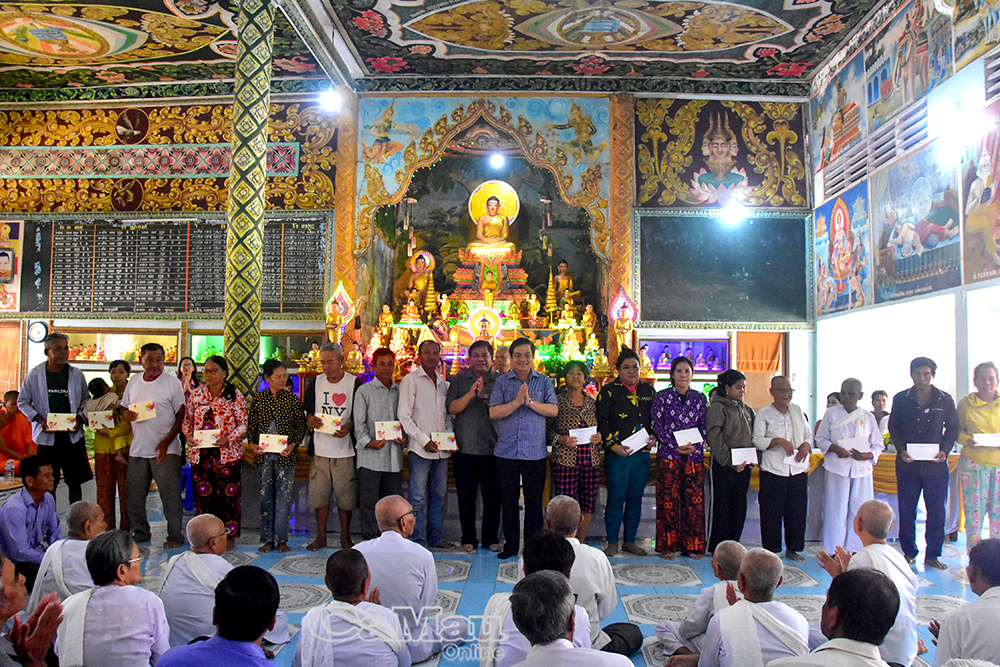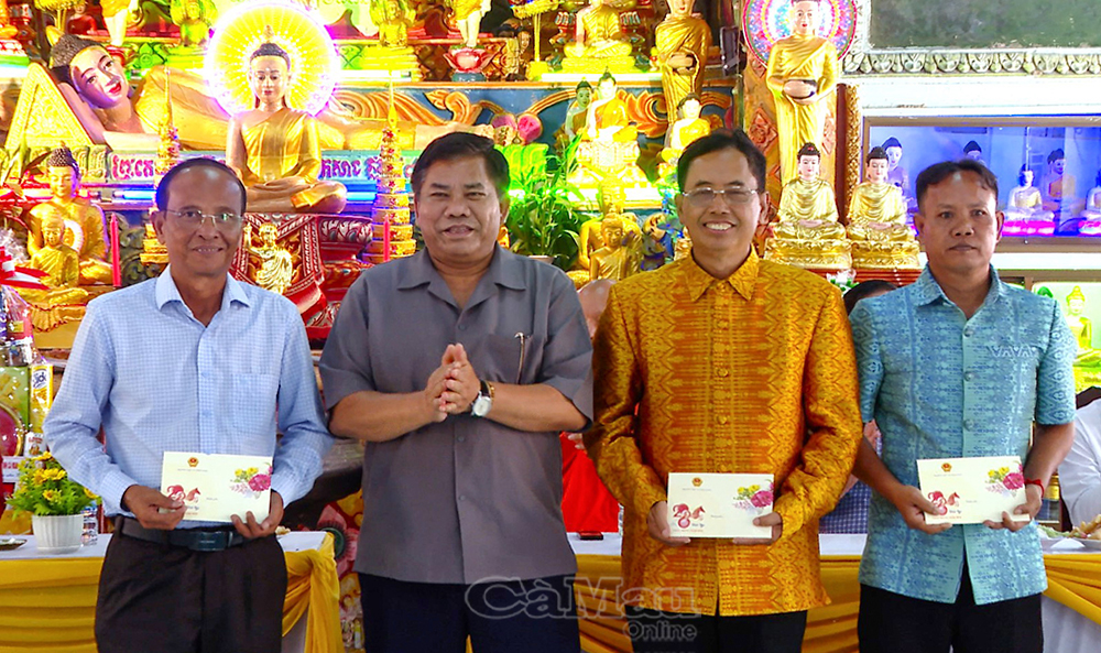 Buổi thăm, chúc tết Chôl Chnăm Thmây tại chùa Xiêm Cán có sự tham dự của đông đảo sư sãi, Ban Quản trị chùa, người có uy tín trong đồng bào dân tộc cùng các gia đình chính sách, bà con phật tử Khmer.