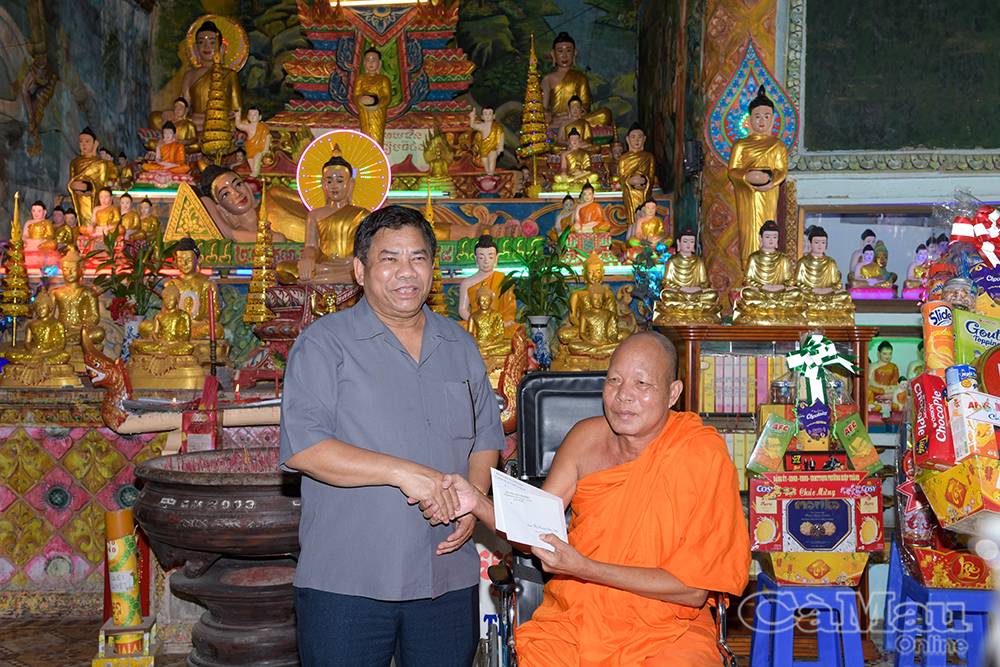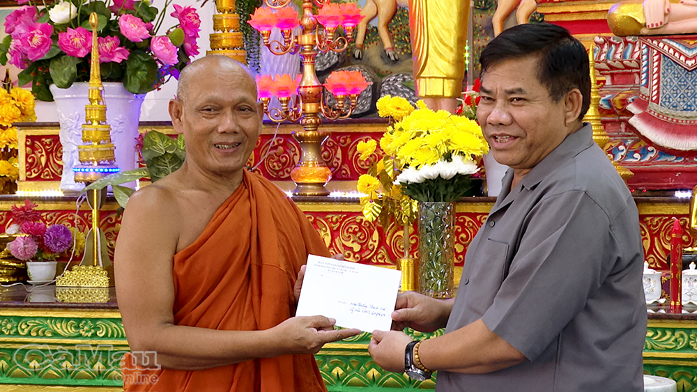 Đồng chí Huỳnh Chí Nguyện, Phó Chủ tịch UBND tỉnh, trao quà của Tỉnh uỷ - HĐND - UBND - Uỷ ban MTTQ Việt Nam tỉnh Cà Mau tặng chùa Xiêm Cán và Hoà thượng Dương Quân.