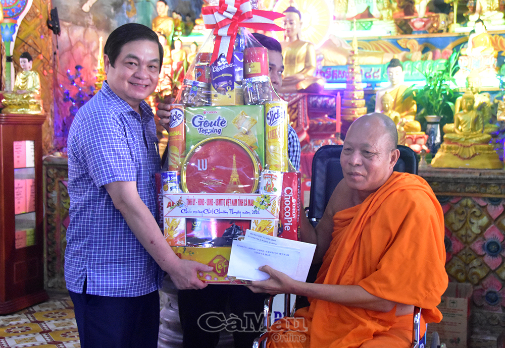 Thứ trưởng Bộ Dân tộc và Tôn giáo Y Thông tặng quà chúc tết đến Hoà thượng Thạch Hà, Trưởng ban Trị sự Giáo hội Phật giáo Việt Nam tỉnh, Chủ tịch Hội Đoàn kết sư sãi yêu nước tỉnh Cà Mau, Trụ trì chùa Monivongsa Bopharam (phường An Xuyên).