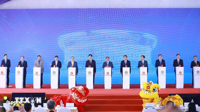 Thủ tướng Phạm Minh Chính và các đại biểu bấm nút khởi công, khánh thành, thông xe kỹ thuật các công trình, dự án. Ảnh: Dương Giang/TTXVN