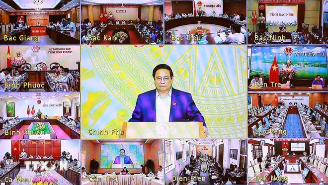 Thủ tướng Phạm Minh Chính chủ trì Phiên họp lần thứ tư của Ban Chỉ đạo xoá nhà tạm, nhà dột nát trực tuyến đến các địa phương. Ảnh: Dương Giang/TTXVN