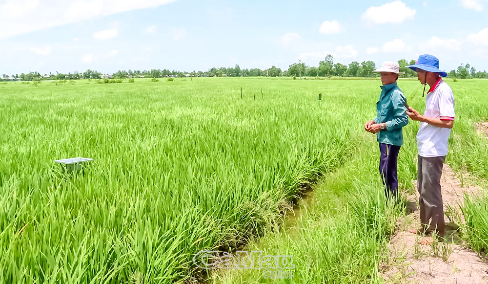 HTX Hồng Phát (xã Vĩnh Thanh) ứng dụng phần mềm quản lý nước trong sản xuất lúa theo hướng phát thải thấp.