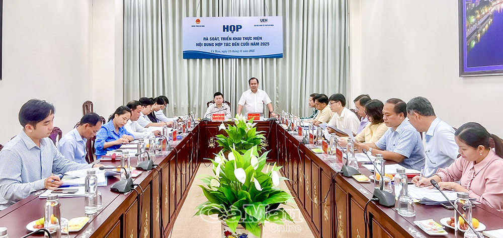 Báo Cà Mau Ngày 11/11, Uỷ viên Ban Thường vụ Tỉnh uỷ, Phó Chủ tịch UBND tỉnh Nguyễn Minh Luân cùng Tiến sĩ Đinh Công Khải, Phó Giám đốc Trường Đại học Kinh tế TP Hồ Chí Minh (UEH), chủ trì cuộc họp rà soát tiến độ và thống nhất các nội dung triển khai hợp tác giữa hai bên đến cuối năm 2025.