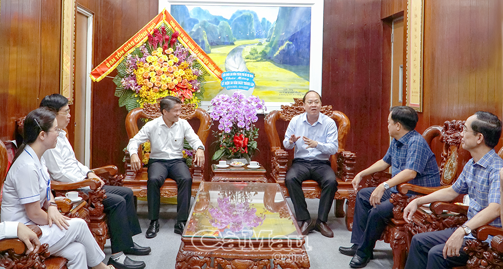 Đồng chí Nguyễn Hồ Hải, Bí thư Tỉnh uỷ Cà Mau (bên phải) đến chúc mừng Ban Giám đốc Bệnh viện Thống Nhất dịp kỷ niệm 50 năm ngày thành lập đơn vị.