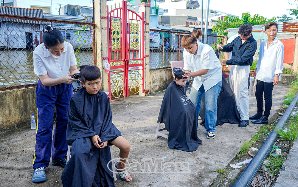 Dù mưa hay nắng tiệm tóc lưu động của bạn Phạm Nhật Phương (bìa phải) và các tình nguyện viên vẫn duy trì xuyên suốt.