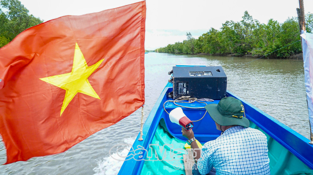 Ở những khu vực đi lại khó khăn trên địa bàn xã Tân Ân, lực lượng tuyên truyền sử dụng vỏ máy gắn loa di động, men theo các tuyến kênh, khu vực ven biển để đưa thông tin về cuộc bầu cử đến từng hộ dân.