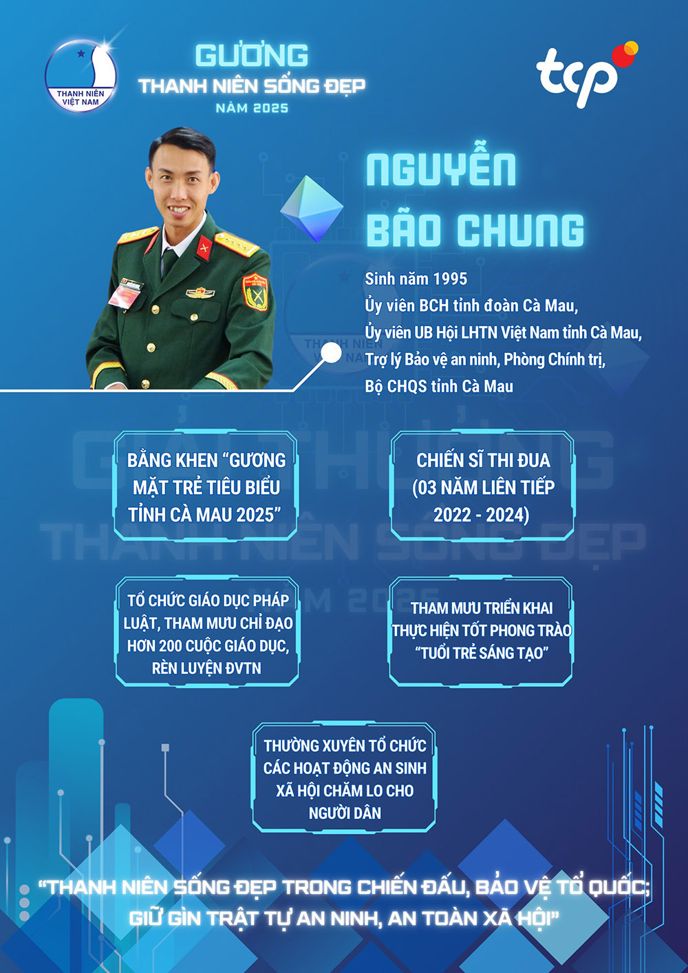 Đại úy Nguyễn Bão Chung (sinh năm 1995) nhiều năm liền đạt danh hiệu Chiến sĩ thi đua, Đảng viên hoàn thành xuất sắc nhiệm vụ (2022-2024); được tặng Bằng khen của UBND tỉnh (2024, 2025), Tổng cục Chính trị (2022), Trung ương Đoàn và Trung ương Hội LHTN Việt Nam (2024, 2025), Tỉnh đoàn Cà Mau (2022-2024). |