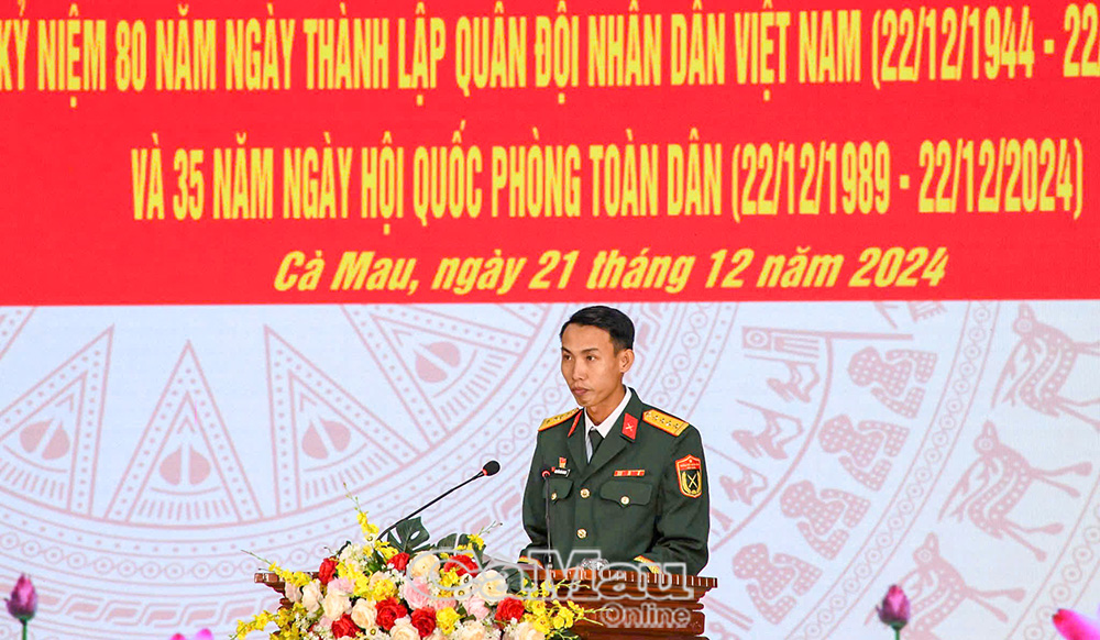 Đại úy Nguyễn Bão Chung cũng đại diện tuổi trẻ các lực lượng vũ trang phát biểu tại Họp mặt kỷ niệm 80 năm Ngày thành lập Quân đội Nhân dân Việt Nam tại Cà Mau (Nhân vật cung cấp).