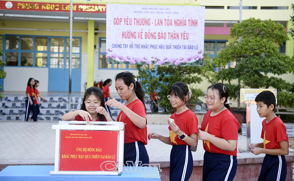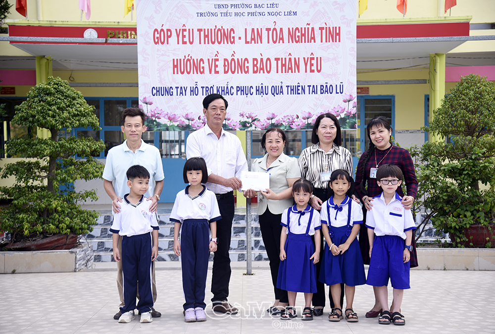 Báo Cà Mau Sau hai đợt phát động, cán bộ, giáo viên, nhân viên, học sinh và phụ huynh Trường Tiểu học Phùng Ngọc Liêm (phường Bạc Liêu) vận động trên 101 triệu đồng ủng hộ đồng bào vùng lũ.