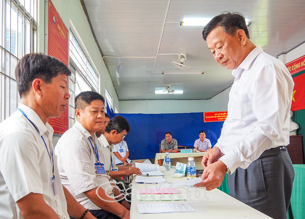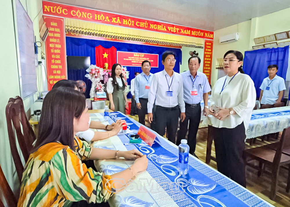 Đồng chí Lê Thị Nhung, Uỷ viên Ban Thường vụ Tỉnh uỷ, Phó Chủ tịch Thường trực HĐND tỉnh, Phó Chủ tịch Uỷ ban Bầu cử tỉnh, kiểm tra công tác tổ chức bầu cử tại Khu vực bỏ phiếu số 1, Ấp 1, xã Đầm Dơi.