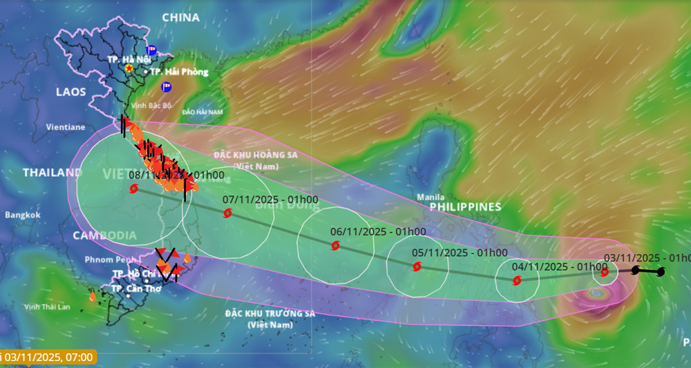 Dự báo trong 24 giờ tới, bão di chuyển chủ yếu theo hướng Tây với tốc độ khoảng 20km/h và cường độ có khả năng mạnh thêm. Đến 7h sáng mai (4/11), vị trí tâm bão trên khu vực miền Trung Philippines với cường độ mạnh lên cấp 12 (118-133km/h), giật cấp 15.