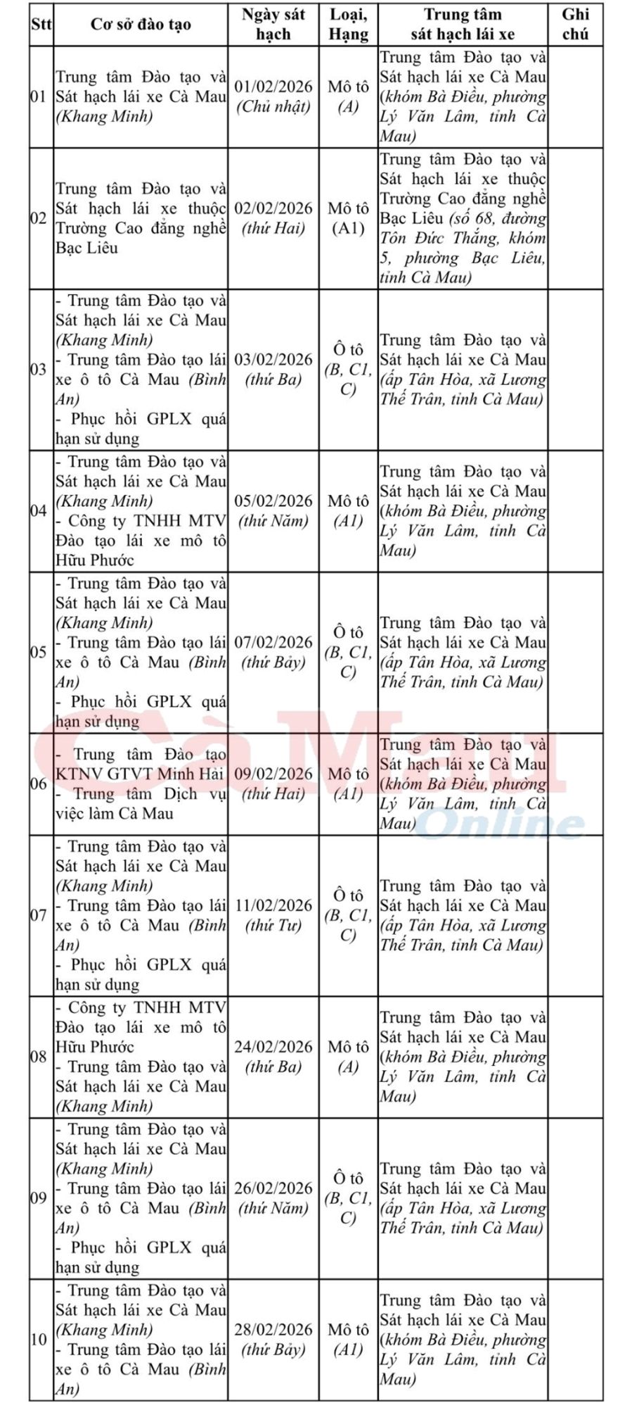 Theo kế hoạch, trong tháng 2/2026, Phòng Cảnh sát giao thông Công an tỉnh Cà Mau dự kiến tổ chức 6 kỳ sát hạch mô tô và 4 kỳ sát hạch ô tô. Mỗi kỳ sát hạch ô tô có từ 300-400 thí sinh, mô tô từ 400-600 thí sinh. Tổng số hồ sơ tham gia sát hạch khoảng 5.200 hồ sơ, gồm 1.500 hồ sơ ô tô và 3.700 hồ sơ mô tô. Đối tượng sát hạch là học viên đủ điều kiện sau đào tạo; thí sinh vắng, trượt các kỳ trước và người có GPLX quá thời hạn theo quy định.
