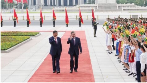Tổng Bí thư Ban Chấp hành Trung ương Đảng Cộng sản Trung Quốc, Chủ tịch nước Cộng hoà nhân dân Trung Hoa Tập Cận Bình và Phu nhân, chủ trì Lễ đón cấp Nhà nước Tổng Bí thư Ban Chấp hành Trung ương Đảng Cộng sản Việt Nam Tô Lâm và Phu nhân thăm cấp Nhà nước tới Trung Quốc vào tháng 8/2024. (Ảnh: TTXVN)