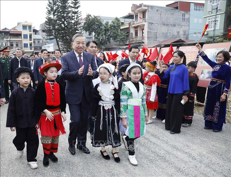 Tổng Bí thư Tô Lâm với Nhân dân các dân tộc tỉnh Cao Bằng. (Ảnh: TTXVN)
