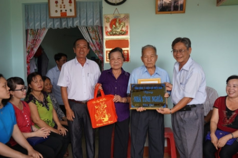 | Đại diện Công ty Điện lực Cà Mau, chính quyền địa phương bàn giao nhà tình nghĩa cho thương binh Phạm Thành Thâu. |
