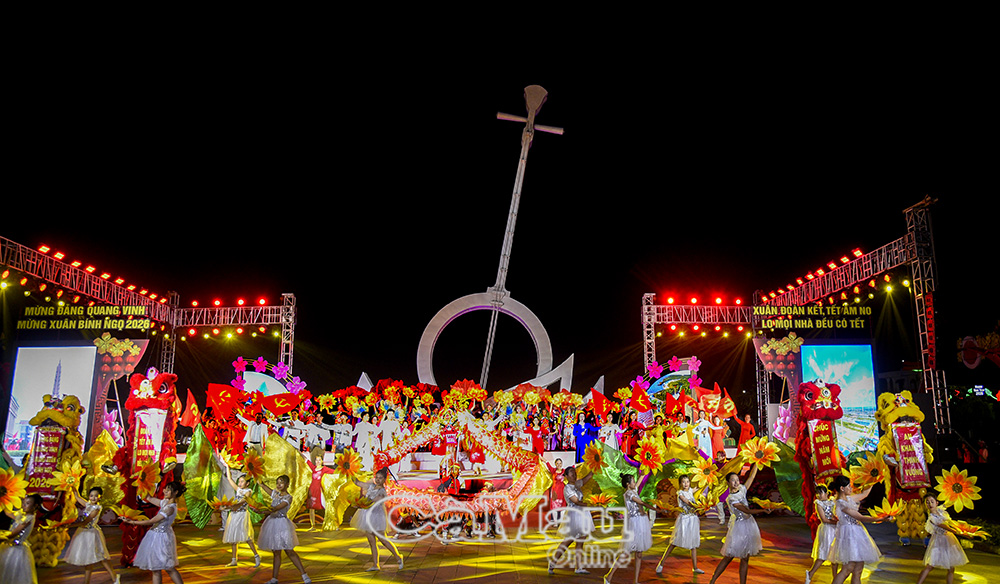 Chương trình mở màn với liên khúc “Tuổi xuân dâng Đảng - Việt Nam ơi mùa xuân đến rồi”, kết hợp màn trình diễn lân - sư - rồng sôi động, ấn tượng.