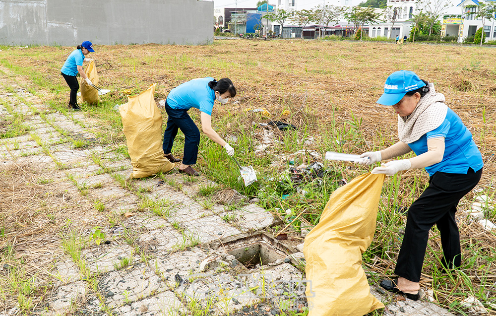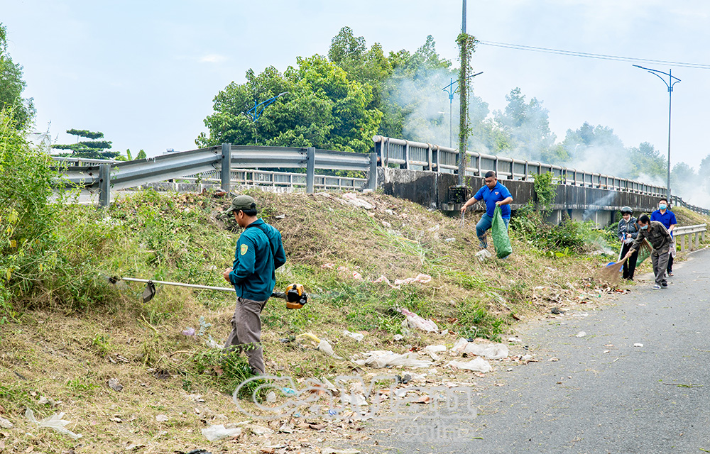 Tại tuyến đường Huỳnh Tấn Phát nối dài và khu vực phía sau Trung tâm Hội nghị tỉnh, các lực lượng tích cực thu gom rác thải sinh hoạt, rác thải nhựa, phát quang cỏ dại trên vỉa hè, góp phần tạo cảnh quan thông thoáng, sạch đẹp.
