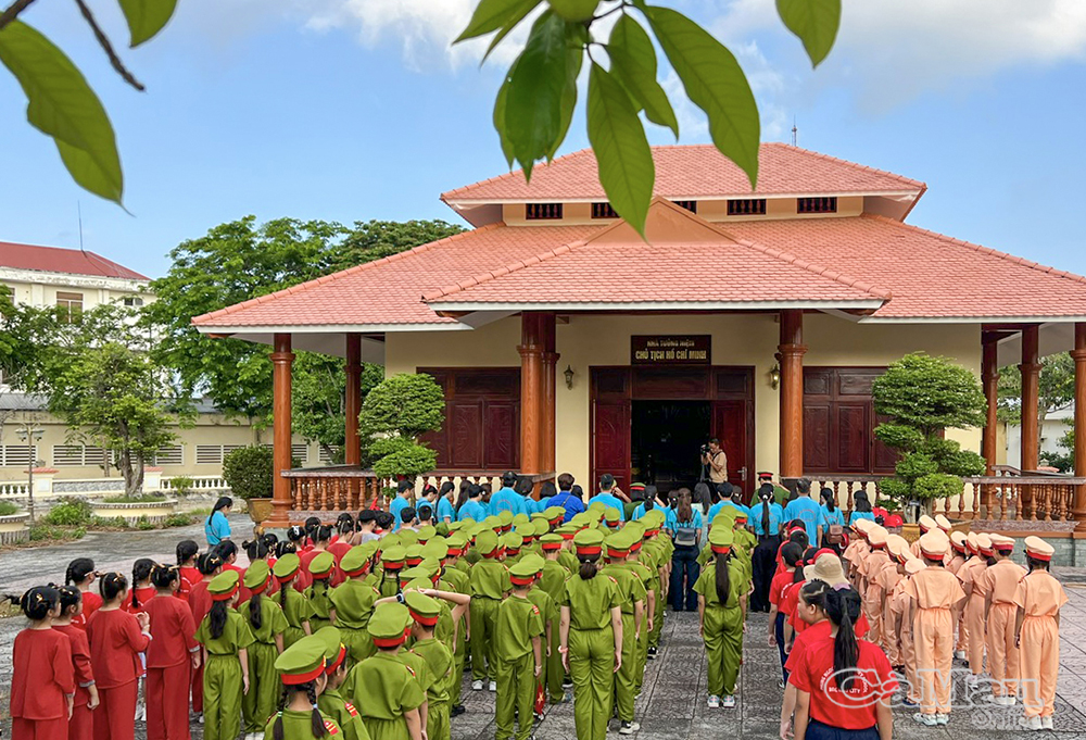 Trước khi trải nghiệm, học sinh Trường Tiểu học Phùng Ngọc Liêm dâng hương tại Phủ thờ Bác Hồ trong khuôn viên Công an phường Bạc Liêu.