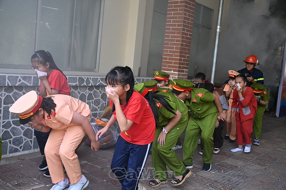 Học sinh thực hành kỹ năng thoát hiểm khi xảy ra cháy.