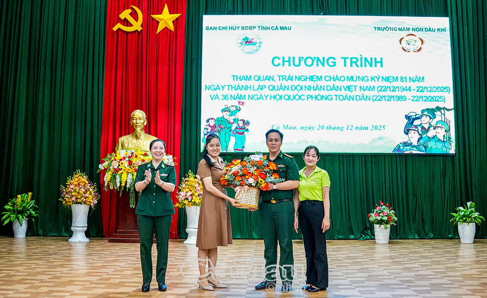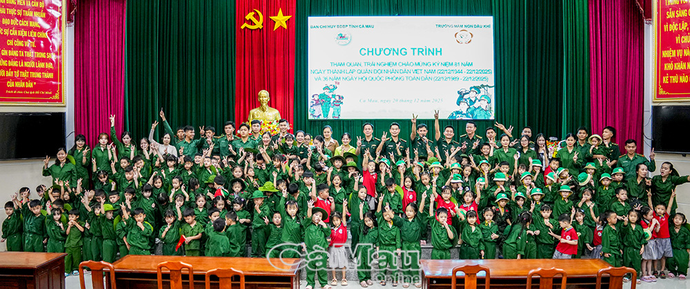 Báo Cà Mau Kỷ niệm 81 năm Ngày thành lập Quân đội Nhân dân Việt Nam (22/12/1944-22/12/2025) và 36 năm Ngày hội Quốc phòng toàn dân (22/12/1989-22/12/2025), ngày 20/12, Đoàn Thanh niên Bộ đội Biên phòng (BĐBP) tỉnh phối hợp với Trường Mầm non Dầu Khí và Trường Mầm non Smile tổ chức chuỗi hoạt động trải nghiệm “Một ngày làm chiến sĩ biên phòng” dành cho các em học sinh.