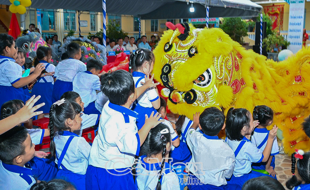 Học sinh hào hứng với tiết mục múa lân sư rồng rộn ràng không khí rằm tháng Tám.