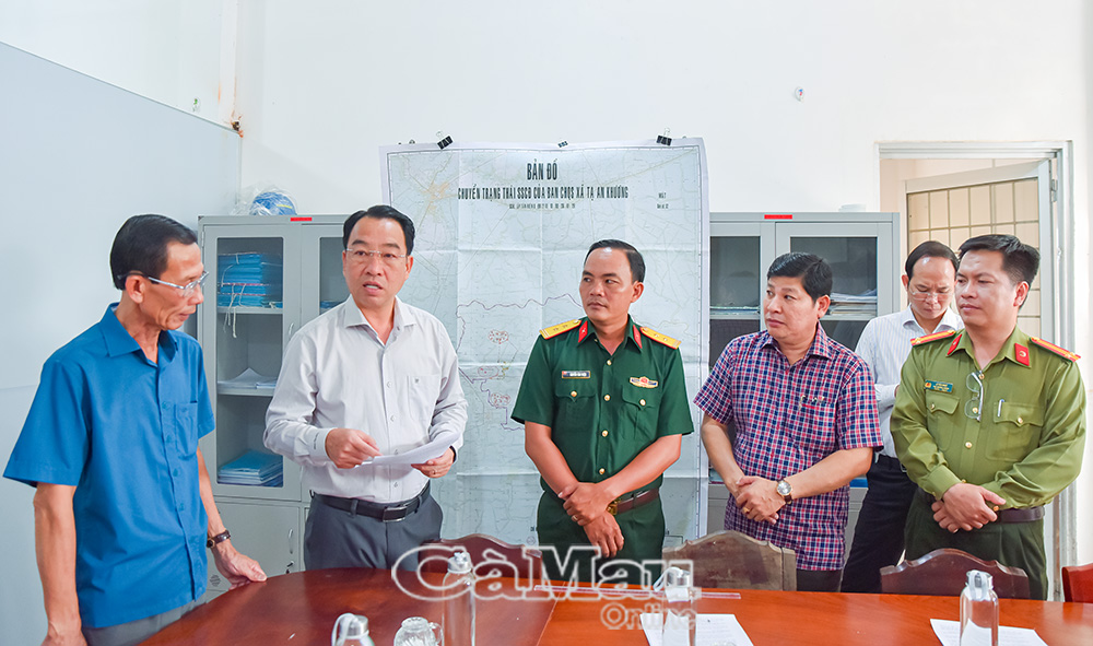 Đồng chí Huỳnh Quốc Hùng, Bí thư Đảng uỷ, Chủ tịch HĐND Xã Tạ An Khương (bìa trái), báo cáo với đoàn về công tác quy hoạch tại địa phương.