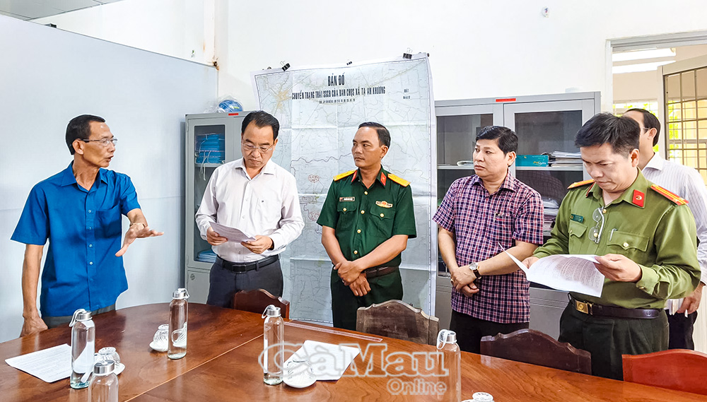 Bí thư Đảng uỷ xã Tân Thuận Phạm Thanh Phong (thứ 2, từ phải sang) trình bày 2 phương án xây dựng trụ sở Công an, Quân sự đảm bảo diện tích theo quy định.