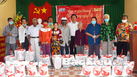 (BL-TQ) Thực hiện chương trình “San sẻ yêu thương - Thêm hương ngày Tết”, ngày 2/2/2021, Ngân hàng TMCP Kiên Long - Chi nhánh Bạc Liêu phối hợp với UBND xã Vĩnh Trạch (TP. Bạc Liêu) tổ chức trao 100 suất quà tết cho 100 hộ cận nghèo địa bàn xã Vĩnh Trạch. Mỗi suất quà trị giá 500 ngàn đồng, gồm: gạo, gia vị.