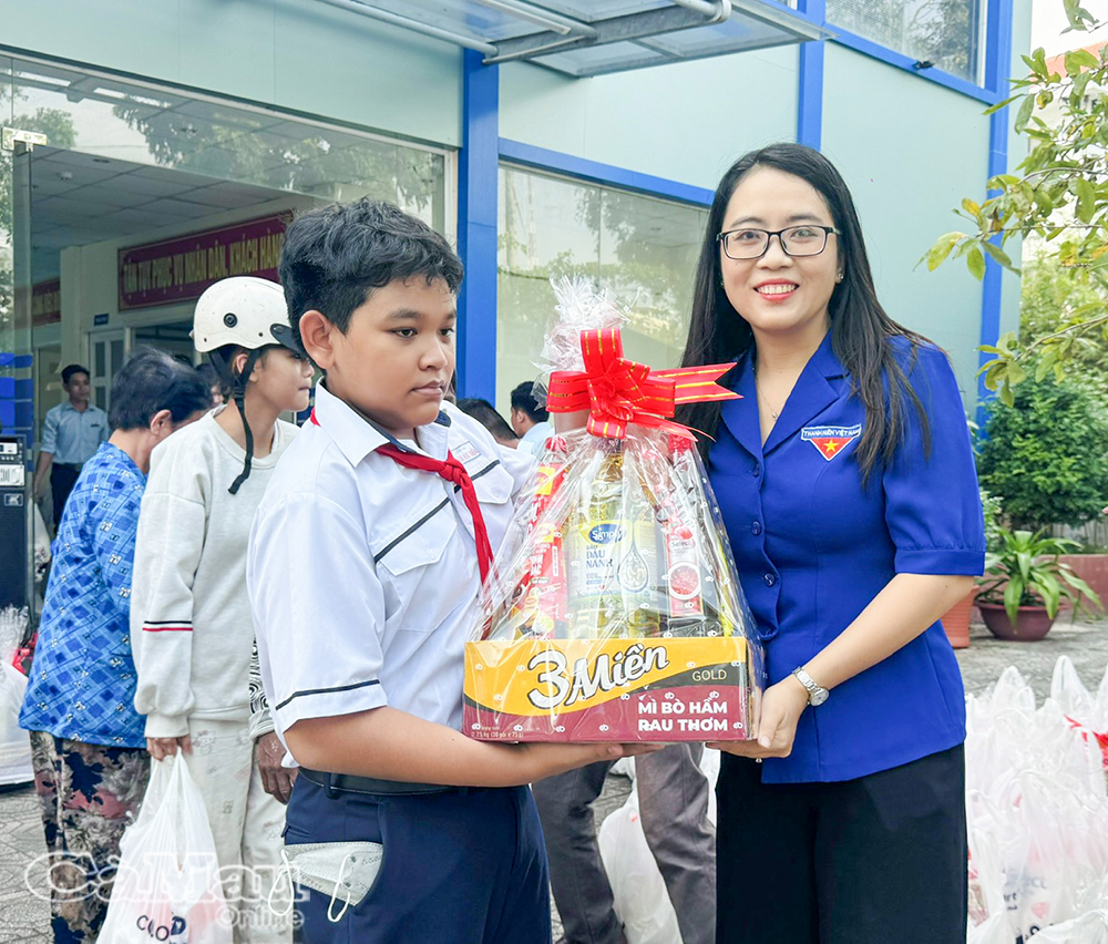 Phó Bí thư Tỉnh đoàn Cà Mau Nguyễn Trang Anh Thư trao quà Tết cho học sinh có hoàn cảnh khó khăn, động viên các em vươn lên trong học tập.