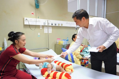 Phó chủ tịch UBND tỉnh Cà Mau Thân Đức Hưởng tặng quà các cháu đang điều trị tại Bệnh viện Sản - Nhi.