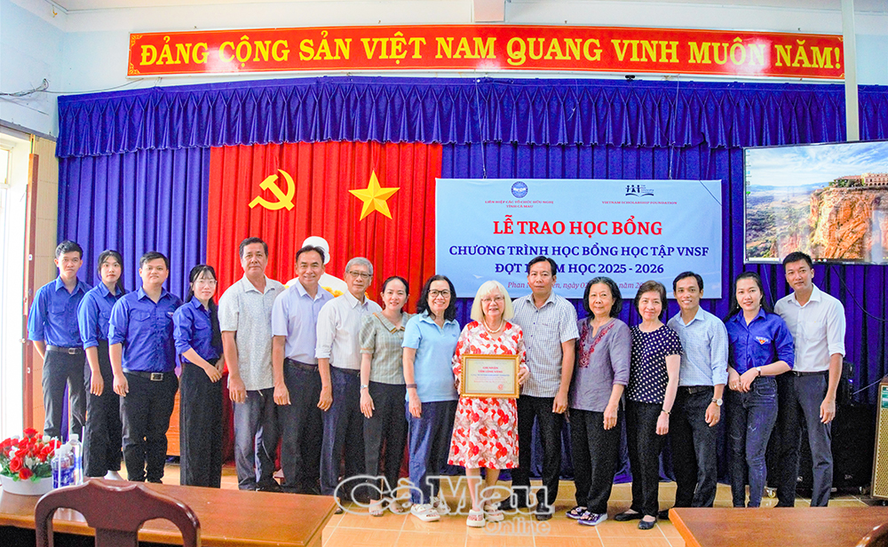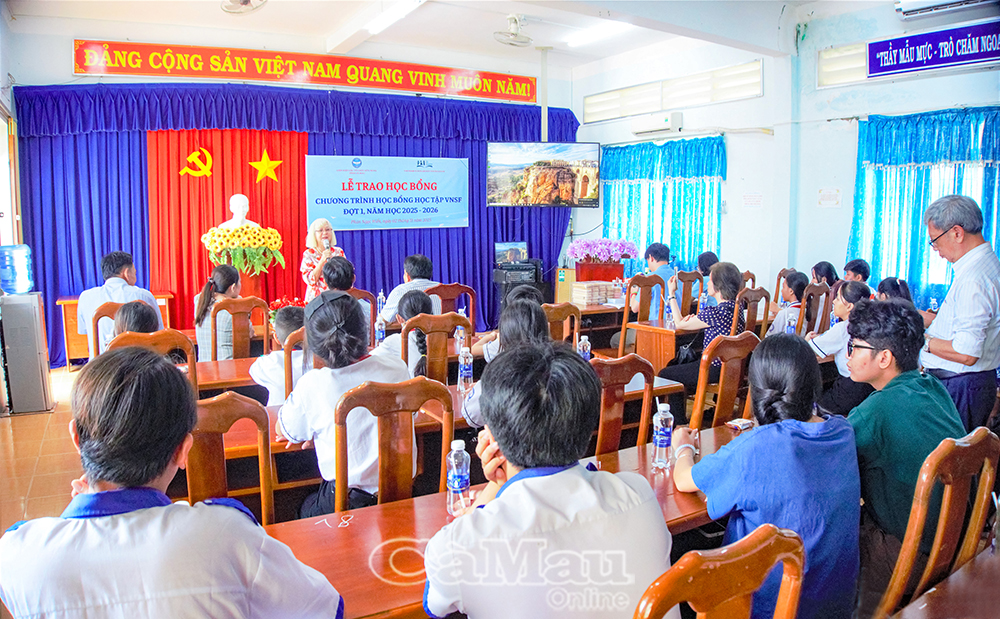 Báo Cà Mau Sáng 2/11, tại Trường THCS Bông Văn Dĩa (xã Phan Ngọc Hiển), Liên hiệp các tổ chức hữu nghị tỉnh Cà Mau phối hợp với UBND xã Phan Ngọc Hiển và Tổ chức The Vietnam Scholarship Foundation (VNSF) tổ chức lễ trao học bổng VNSF học kỳ I, năm học 2025-2026 cho học sinh thuộc 3 xã: Tân Ân, Đất Mũi và Phan Ngọc Hiển.